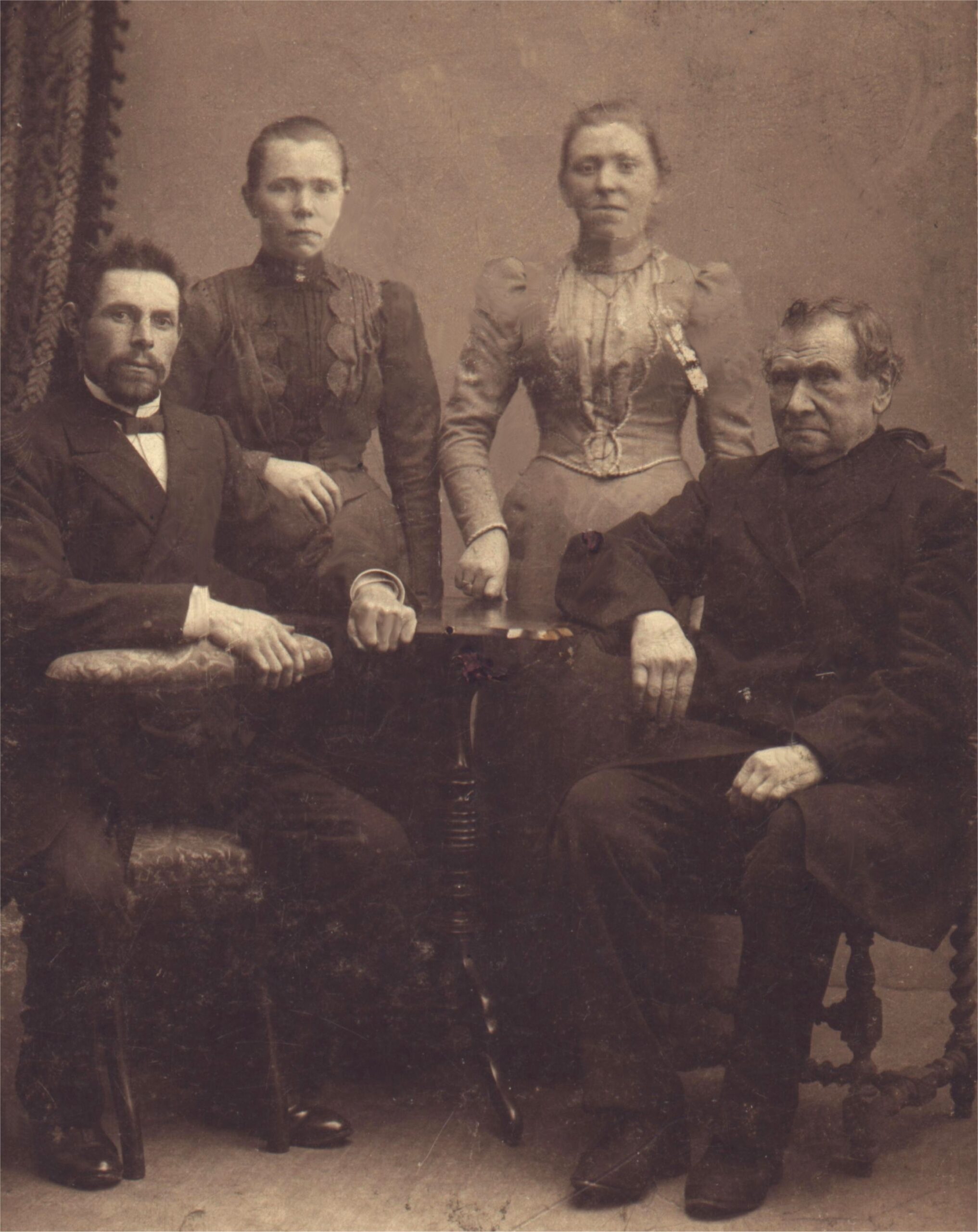From left: Jan Pieter (Jan) van Meeuwen (born 28 juni 1863), his wife Maria van Baardewijk (born 16 aug. 1868), her sister Adriana Gozina (Jaantje, born 7 aug. 1874) and their father Cornelis (born 15 dec. 1827).